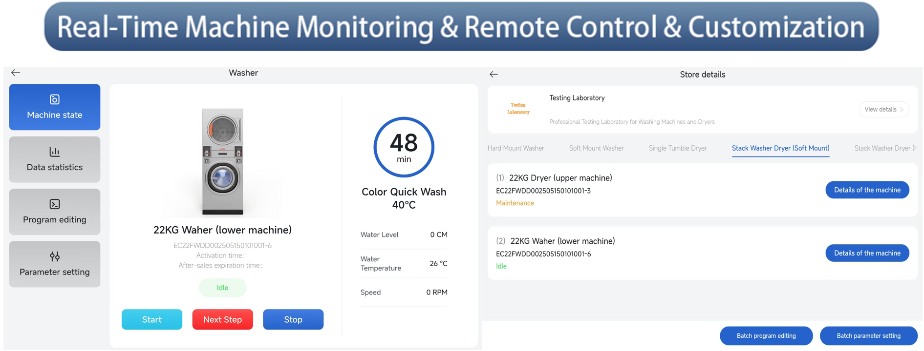 บริษัทใช้ชุดแม่พิมพ์และสายการผลิตอัตโนมัติ เช่น อุปกรณ์แม่พิมพ์ หุ่นยนต์เชื่อมอัตโนมัติ เป็นต้น เพื่อให้มั่นใจในความแม่นยำของการประมวลผลที่สมบูรณ์แบบและความแข็งแรงเชิงกลของผลิตภัณฑ์ ในเวลาเดียวกัน บริษัทยังได้พัฒนาระบบแผงควบคุมหลักและแอปรีโมทอย่างอิสระสำหรับเครื่องซักผ้าเชิงพาณิชย์ ซึ่งมอบประสบการณ์การใช้งานที่ยอดเยี่ยมด้วยการผสมผสานกับขั้นตอนการซักและการอบแห้งที่เป็นวิทยาศาสตร์มากขึ้น